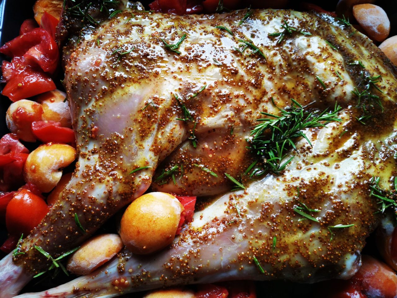 Quelques oreillons d’abricot tirés du congélateur, du miel, de la cannelle et moutarde tirés du placard, un bon cabri, et hop la recette s’orchestre dans ma tête… Y a plus qu’à !