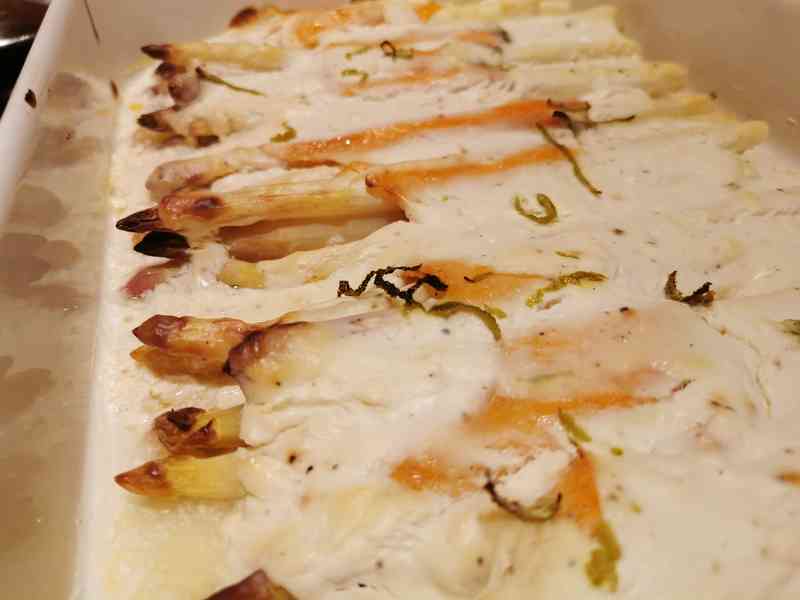 - Enfournez pendant 20 à 25 minutes, jusqu’à ce que les asperges soient tendres et la sauce légèrement dorée.