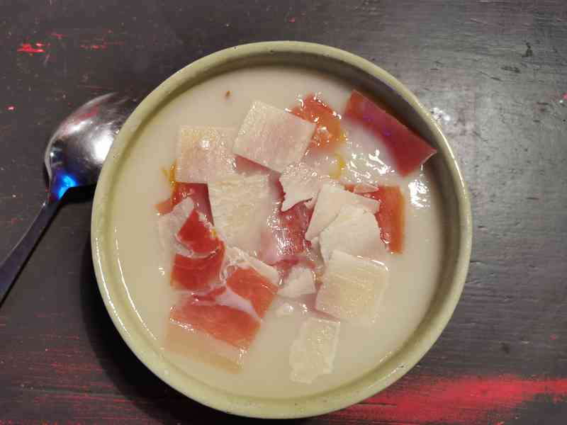 Parsemez  chaque bol de velouté de jambon de parme et de copeaux de parmesan